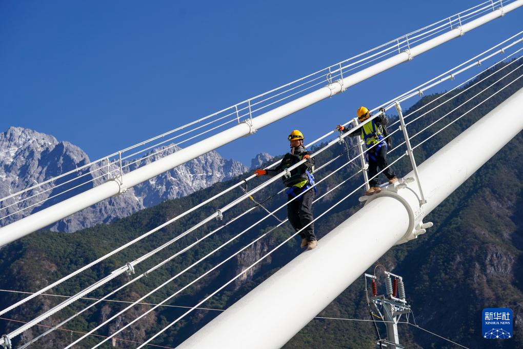 1月24日,工區(qū)職工劉榕基和工區(qū)班長楊應(yīng)文在主纜巡檢。新華社記者 陳欣波 攝