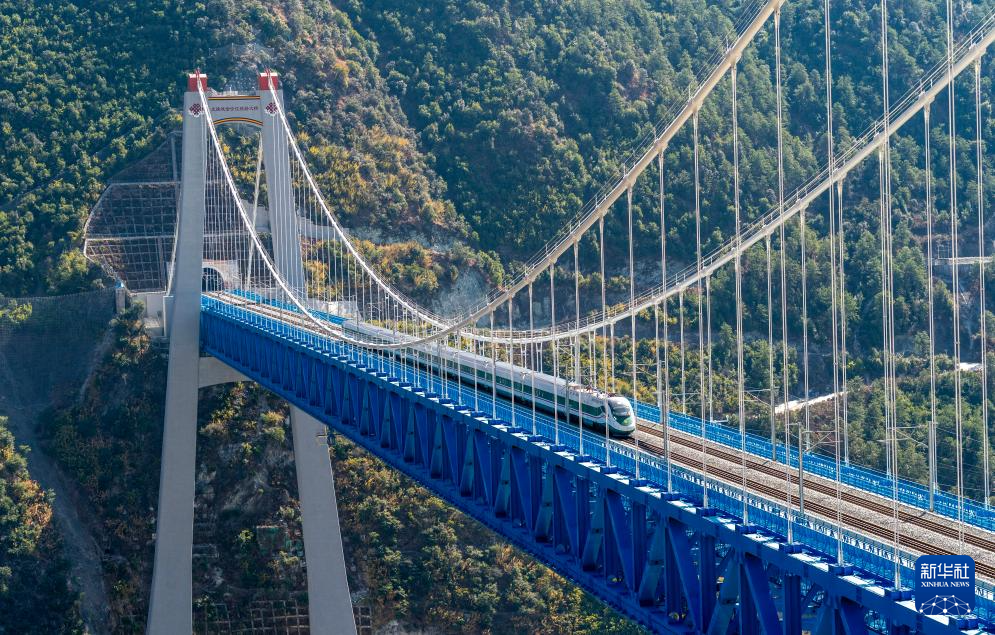 1月24日,列車通過虎跳峽金沙江鐵路大橋。新華社記者 陳欣波 攝