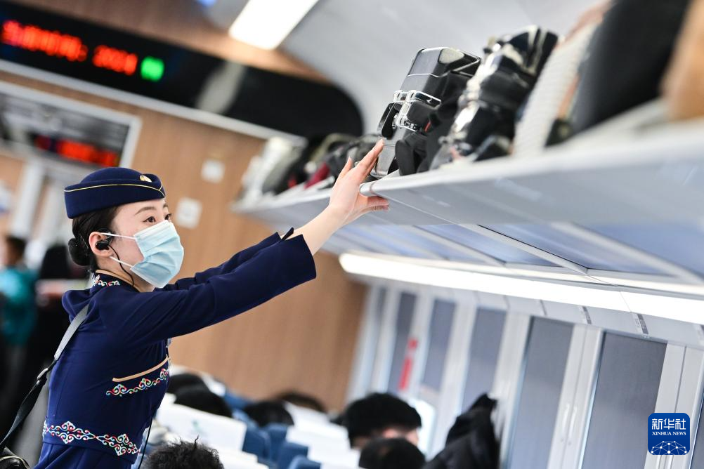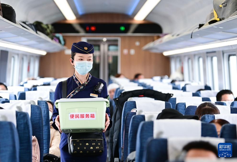 1月30日,中國(guó)鐵路青藏集團(tuán)有限公司西寧客運(yùn)段動(dòng)車隊(duì)乘務(wù)員王璐在為旅客服務(wù)。新華社記者 張龍 攝