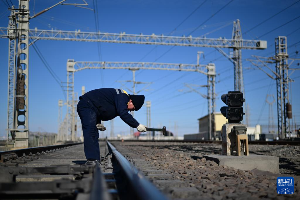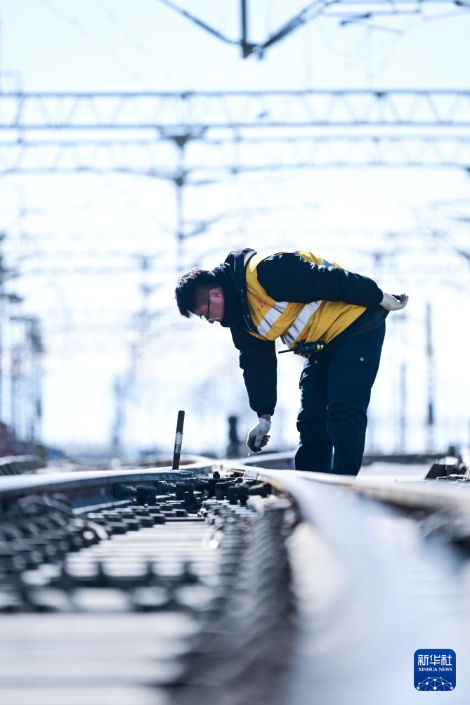 1月29日,格爾木電務(wù)段格爾木東信號車間察爾汗信號工區(qū)職工楊正宏在對察爾汗站道岔進行檢修作業(yè)。新華社記者 張龍 攝