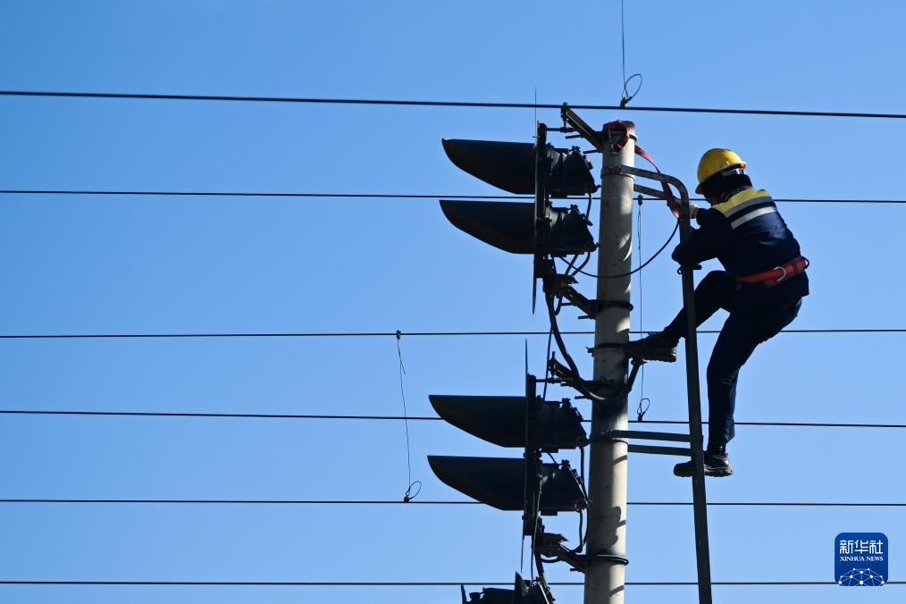 1月29日,格爾木電務(wù)段格爾木東信號車間察爾汗信號工區(qū)職工何江東在高柱信號機上檢查信號機安裝螺絲是否緊固。新華社記者 張龍 攝