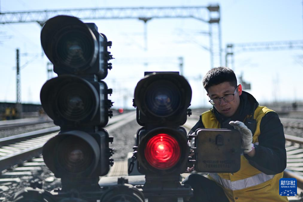 1月29日,格爾木電務(wù)段格爾木東信號車間察爾汗信號工區(qū)副工長張世鐸在指揮調(diào)整信號機顯示。新華社記者 張龍 攝