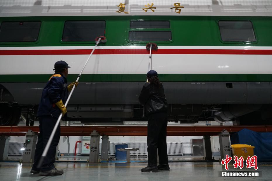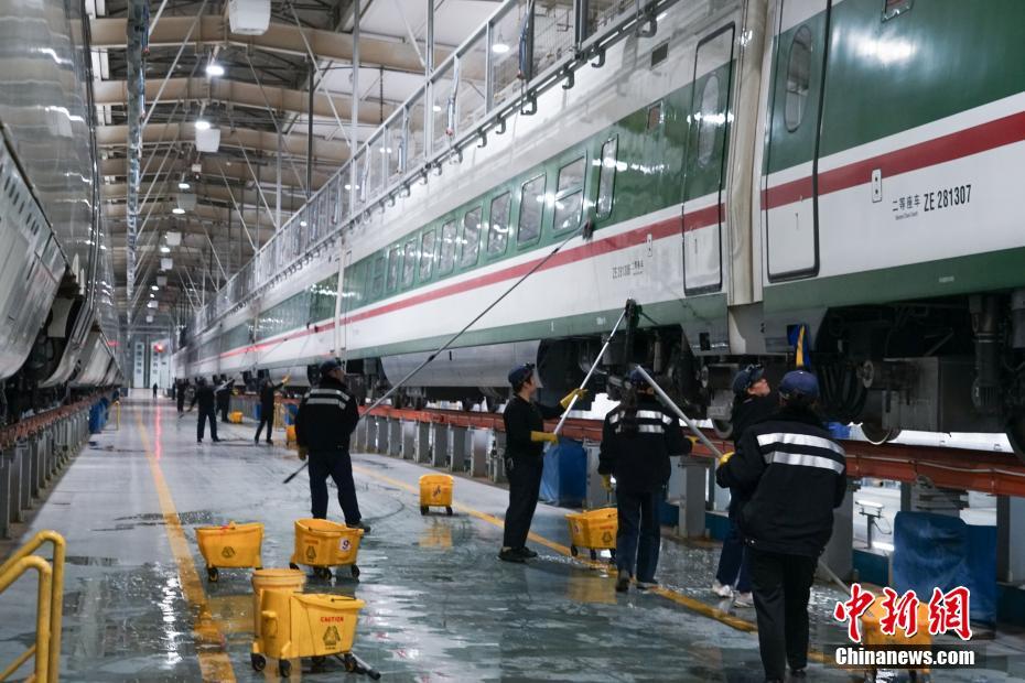 1月30日晚,在青藏鐵路公司西寧車輛段動車運用車間,工作人員在無電作業(yè)時進行動車清潔。中新社記者 馬銘言 攝