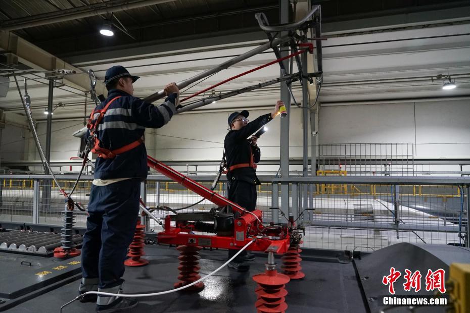 1月30日晚,在青藏鐵路公司西寧車輛段動車運用車間,地勤機械師在無電作業(yè)時進行車頂受電弓的功能檢查及測漏檢測。中新社記者 馬銘言 攝