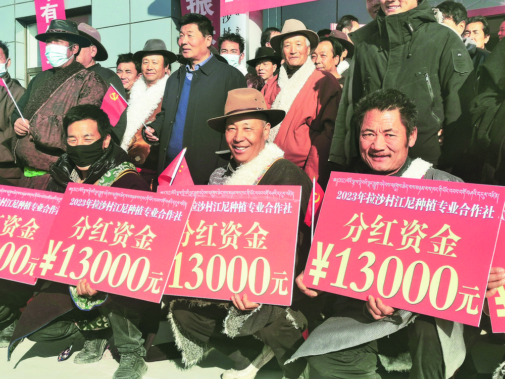 這是拉沙村江尼種植專(zhuān)業(yè)合作社的第三次分紅,也是分紅金額最大的一次。與村民一起將煙花爆竹放置在院落四周,村黨支部書(shū)記旦增尖措臉上寫(xiě)滿了喜悅:“今天我們村又迎來(lái)了集體產(chǎn)業(yè)分紅,這次分紅84.5萬(wàn)元,社員平均1.3萬(wàn)元,大家切切實(shí)實(shí)享受了好政策帶來(lái)的紅利?!?/p>