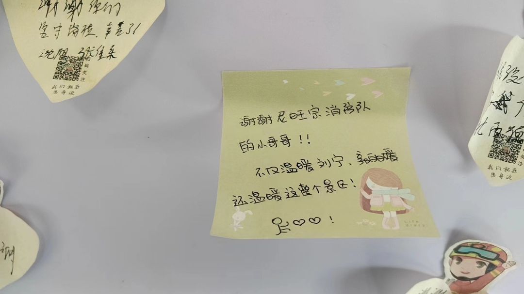 隊(duì)員們細(xì)致暖心的幫助與關(guān)懷,讓兩位遠(yuǎn)方的朋友萬分感激,并主動(dòng)在“藍(lán)焰貼心服務(wù)留言墻”留下了他們最簡單最純真最溫暖的話語:“謝謝尼旺宗消防隊(duì)的小哥哥,不僅溫暖劉寧、郭麗媛,還溫暖這整個(gè)景區(qū)!”