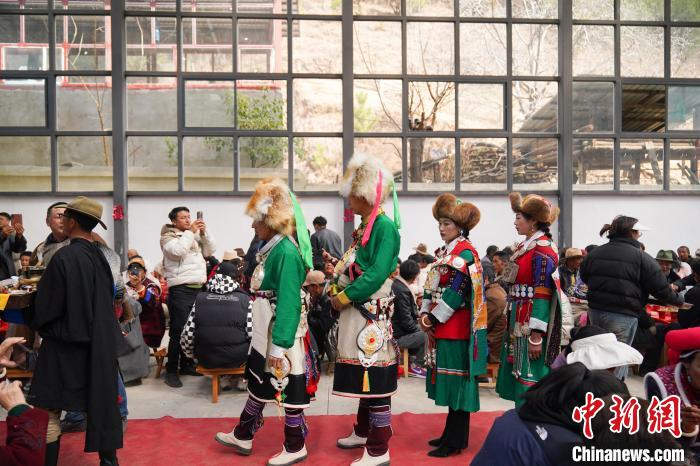 尼汝村傳統(tǒng)藏族婚禮持續(xù)三天,頭兩天是“大小相幫”,村里親朋好友前來幫助準(zhǔn)備食材,第三天正式娶親、接受祝福、宴請(qǐng)賓客、對(duì)歌跳舞。