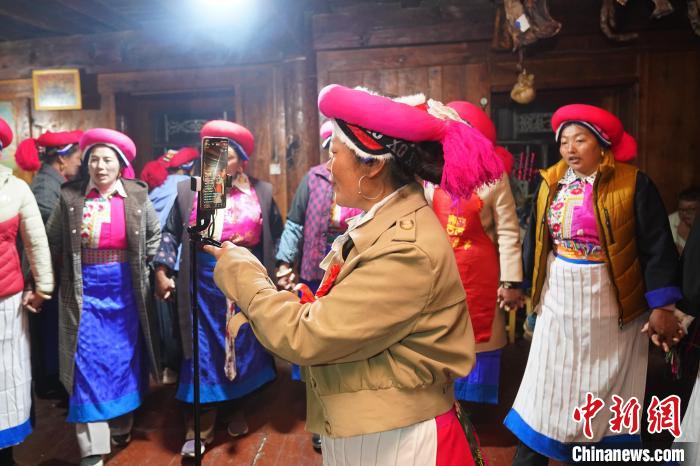2月20日,賓客通過網(wǎng)絡(luò)向外界直播傳統(tǒng)藏式婚禮。中新社記者 劉冉陽 攝