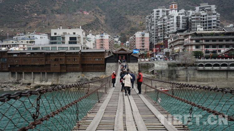 圖為西橋頭視角瀘定橋,游客在中間三條木板通行,救生員在兩側(cè)的木板保護(hù)游客安全 攝影:張宇