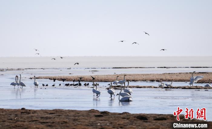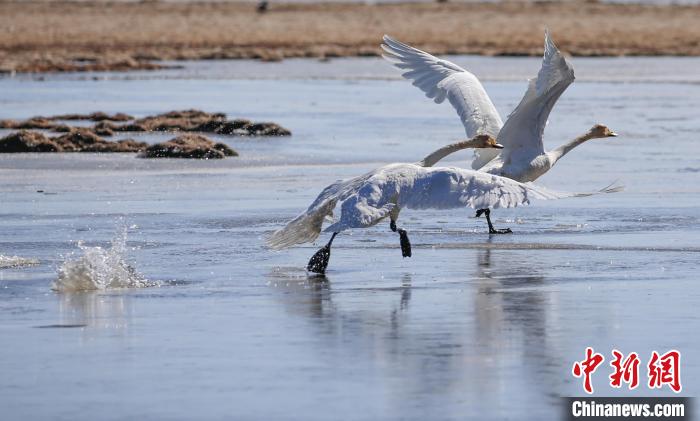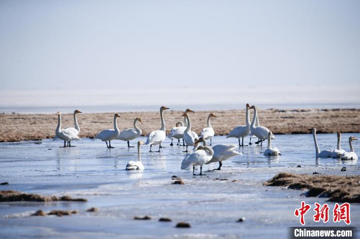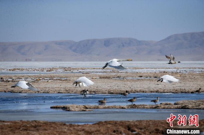 3月13日,青海省海南藏族自治州共和縣境內(nèi)的青海湖泉灣濕地,大天鵝沐浴春日暖陽(yáng)。隨著天氣轉(zhuǎn)暖,大天鵝、斑頭雁、赤麻鴨等水鳥聚集在青海湖泉灣濕地,時(shí)而振翅飛翔、時(shí)而戲水覓食,鳴叫聲不絕,為仍處于冰封的青海湖增添生機(jī)和活力。