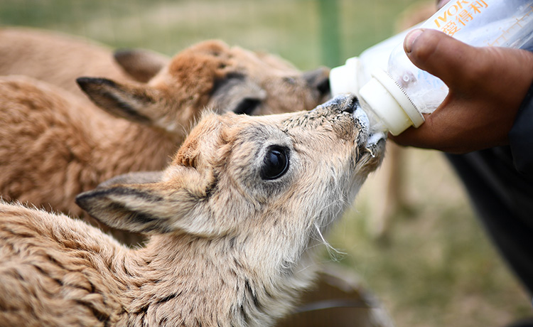 2023年7月28日,可可西里管理處索南達杰保護站隊員才仁多杰在給被救助的藏羚羊幼仔喂奶。(張宏祥 攝)