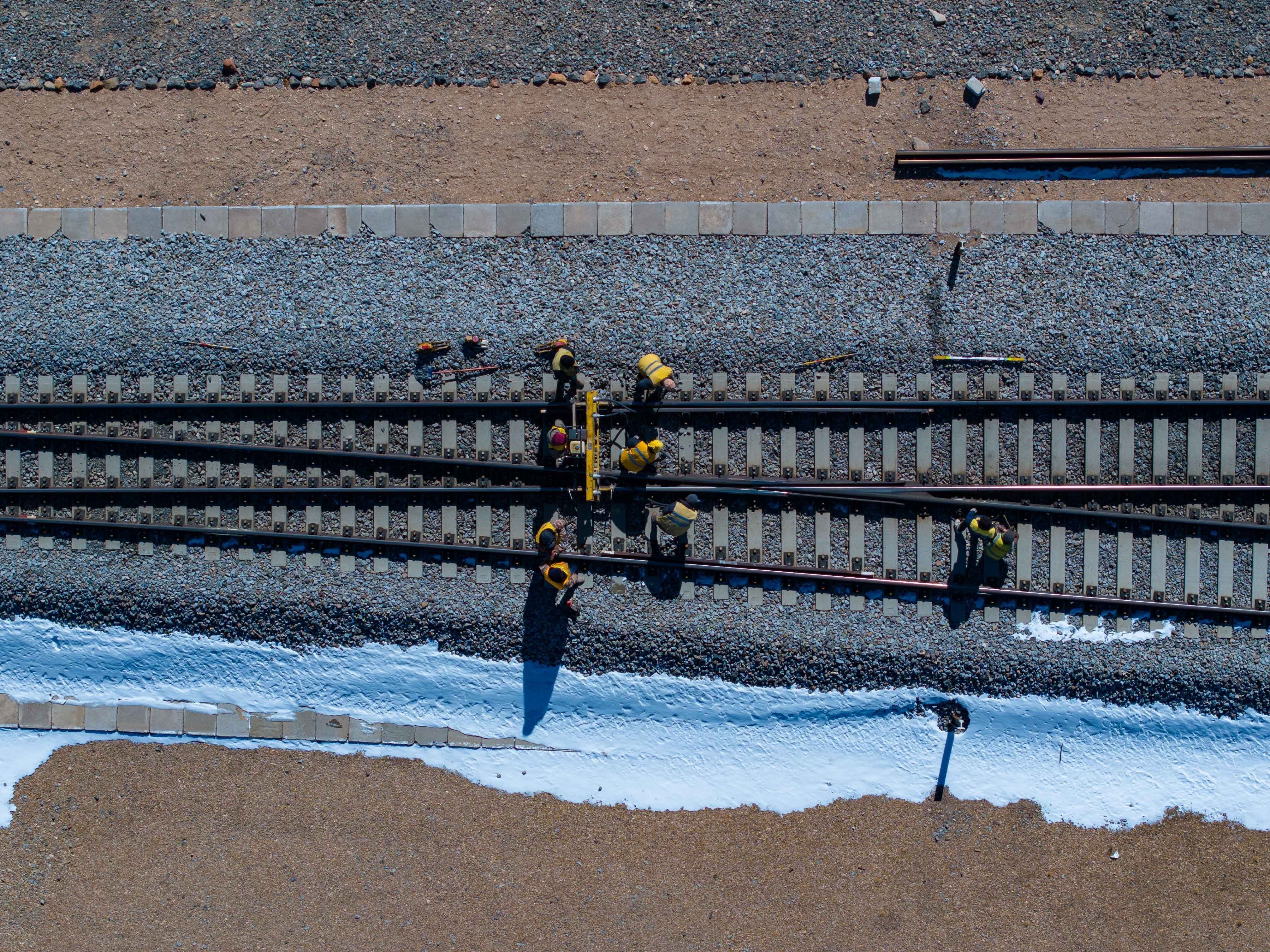 他帶著工人們迅速出動,抵達現(xiàn)場時已經(jīng)是過了12點。這時天窗鄰近,他們迅速做好準備,第一時間沖到鐵軌上施工。黑夜里,幾個微小的燈光在茫?;囊吧匣蝿?,隱約區(qū)分出鐵路的軌跡。