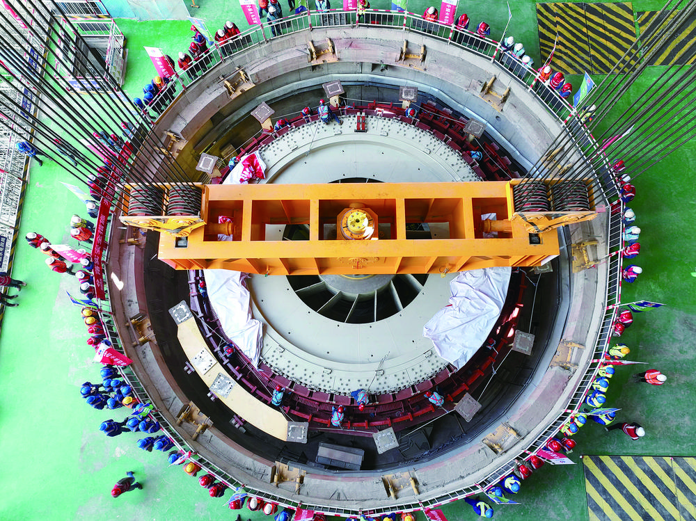 黃河羊曲水電站首臺機(jī)組轉(zhuǎn)子吊裝完成。 黃河公司供圖