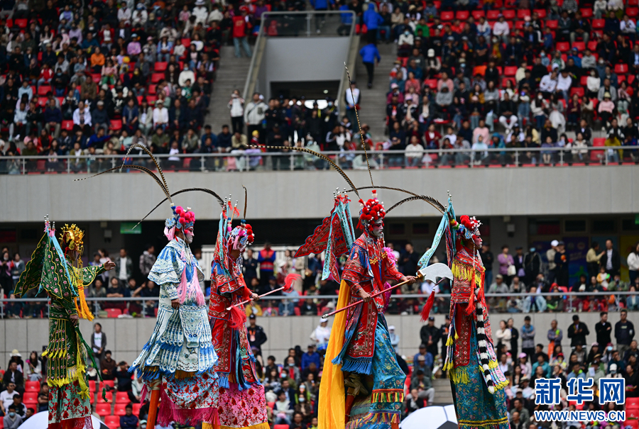 開(kāi)幕式現(xiàn)場(chǎng),非遺高蹺走進(jìn)綠茵場(chǎng)。新華社記者 張龍 攝