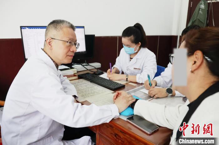 圖為上海援青醫(yī)療人才、青海省中醫(yī)院醫(yī)務(wù)科副主任張圣宏為患者把脈。張?zhí)砀?攝