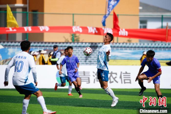 圖為海北祁連山藏羊隊(duì)隊(duì)員(白衣)在比賽中爭(zhēng)頂頭球。馬銘言 攝