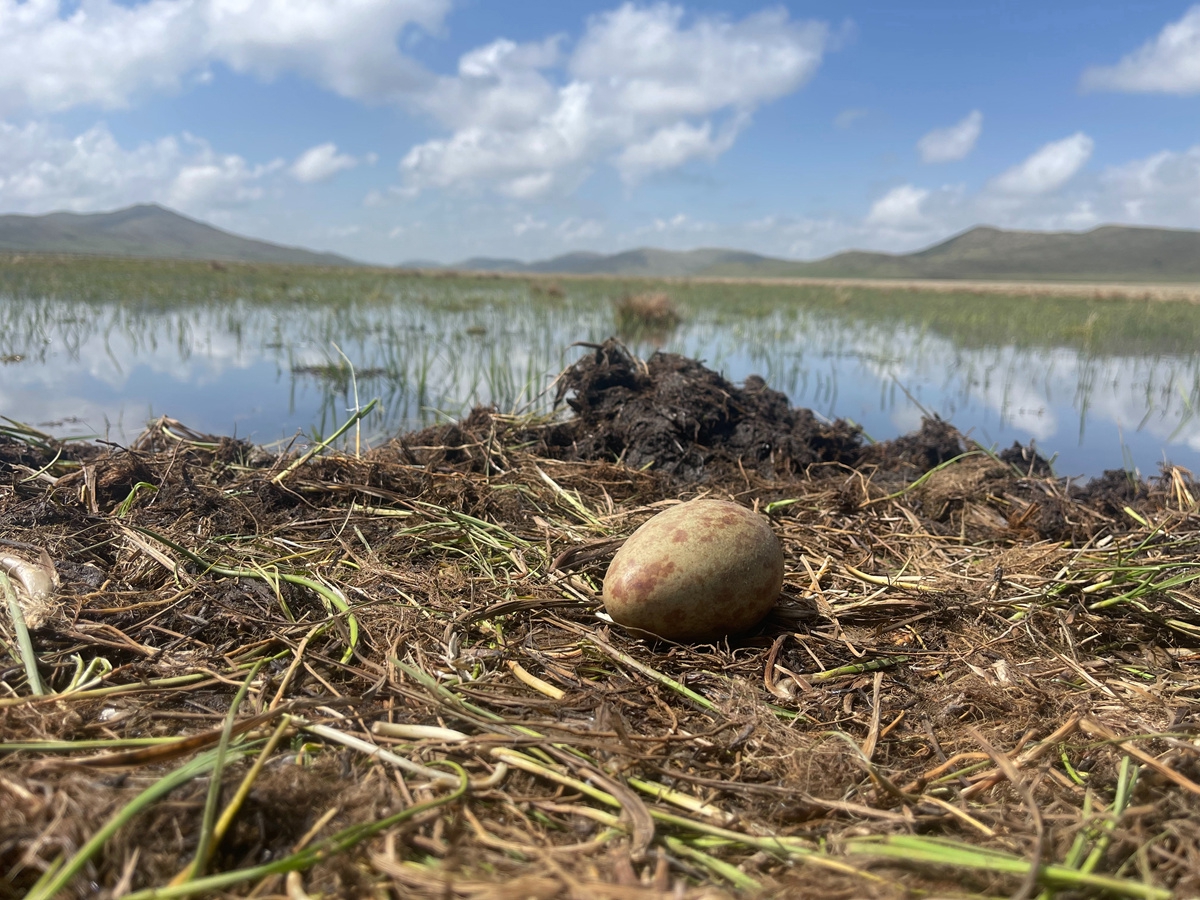 今年3月中旬,首批在云貴高原越冬的黑頸鶴來到若爾蓋濕地國家級自然保護區(qū),在保護區(qū)進行新一輪適應(yīng)和筑巢后,迎來了繁育期。這對正在產(chǎn)卵的黑頸鶴夫婦是當?shù)氐摹袄吓笥选保衲暌咽撬鼈冊诖诉B續(xù)繁育的第五個年頭。