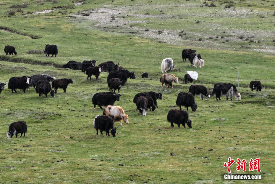 6月4日,航拍青海省海北藏族自治州剛察縣草原上,成群牦牛正在覓食。(無(wú)人機(jī)照片)馬銘言 攝