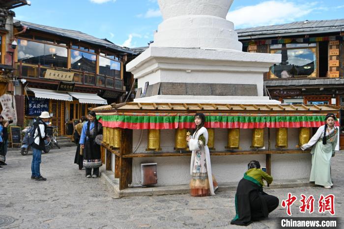 6月10日,游客身著富有民族風情的服裝在獨克宗古城游覽、拍照。李嘉嫻 攝