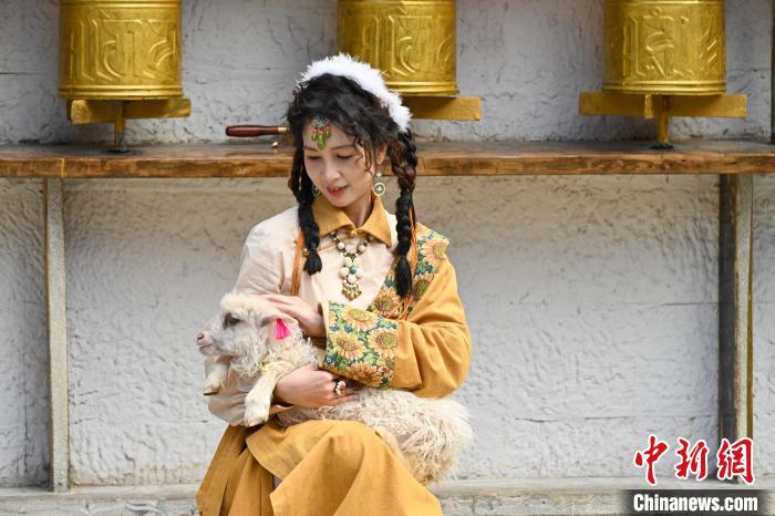 6月10日,游客身著富有民族風情的服飾撫摸懷中小羊。李嘉嫻 攝
