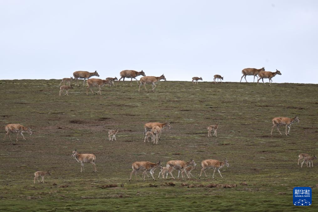 7月9日,在可可西里卓乃湖區(qū)域,一群藏羚羊在活動(dòng)。新華社記者 張龍 攝