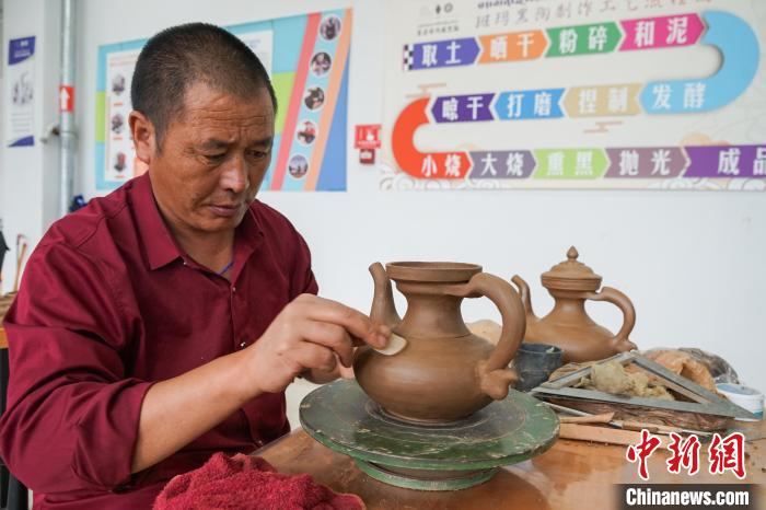 7月18日,在班瑪黑陶培訓及體驗中心,非遺傳承人謝格太正在清點陶坯數(shù)量。中新社記者 馬銘言 攝