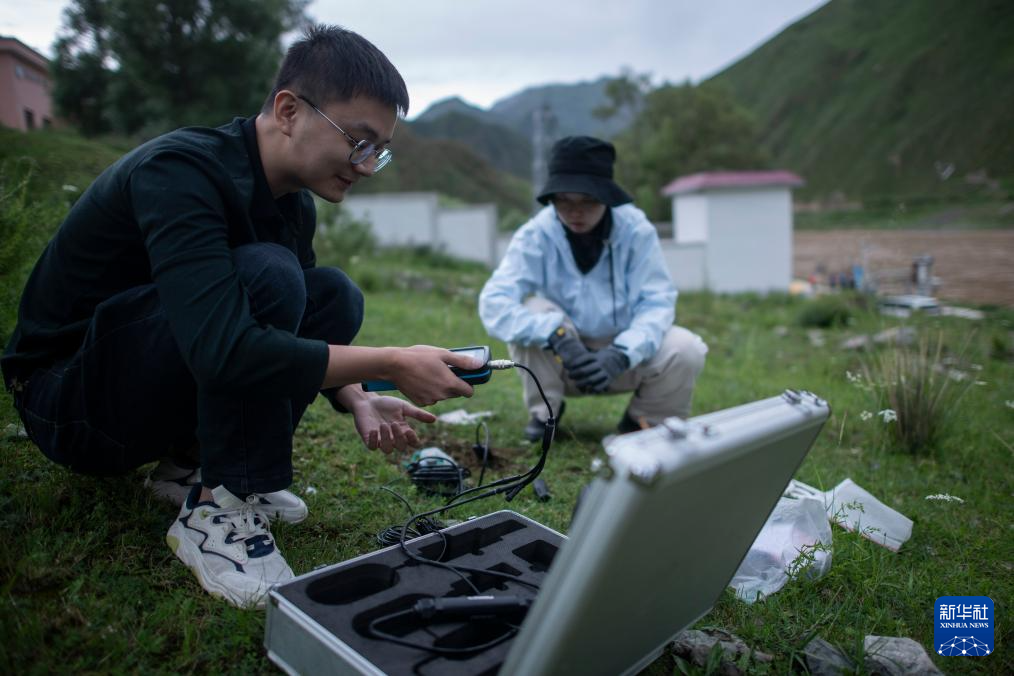 7月20日,在直門達水文站,長江科學(xué)院空間信息技術(shù)應(yīng)用研究所廖茂昕(左)和付珺琳進行土壤多參數(shù)檢測。新華社記者 伍志尊 攝