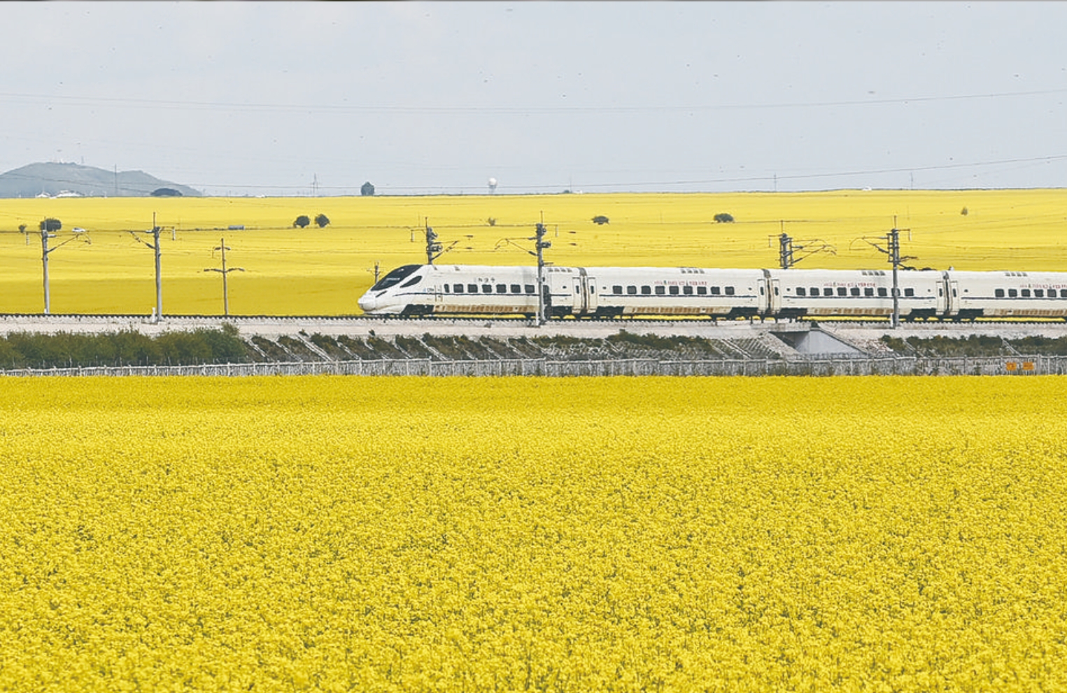 7月18日,一列動(dòng)車正穿行在青海省海北藏族自治州門源回族自治縣的百里油菜花海。有“中國最美油菜花海”之美譽(yù)的門源油菜花海已進(jìn)入盛花期,7月也是最美的觀賞季。(祁國彪 攝)