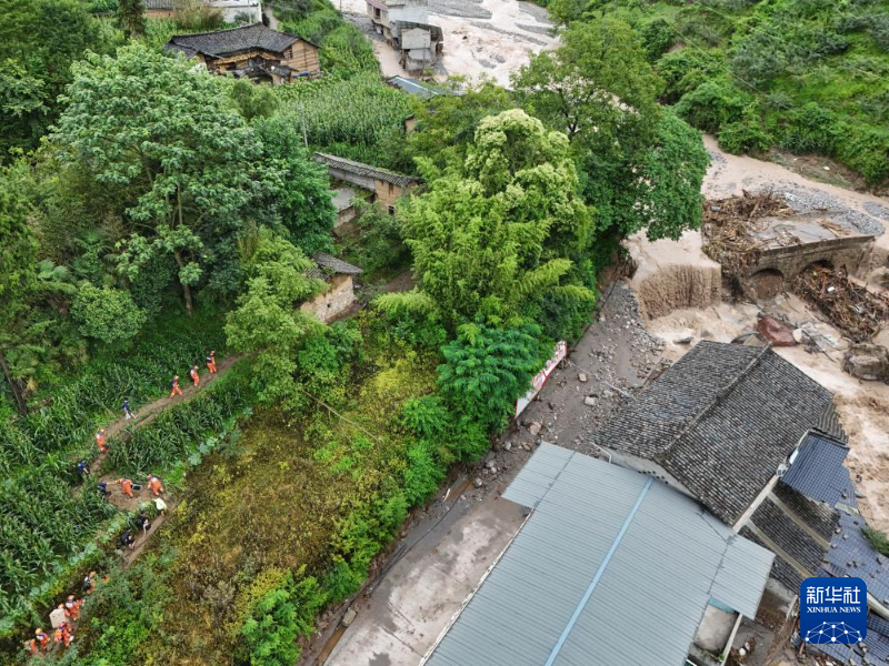 7月21日,救援人員在四川省雅安市漢源縣馬烈鄉(xiāng)新華村進(jìn)行搜救(無(wú)人機(jī)照片)。新華社記者 王曦 攝