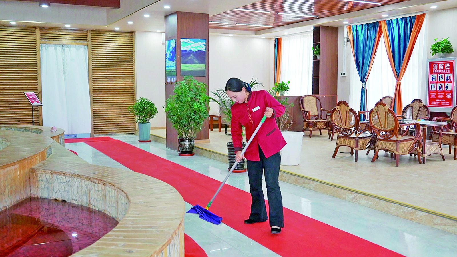 2020年,昂秀拉夫旦利用鄉(xiāng)村振興資金將原先的小房子拆除,改造成溫泉酒店,增加村級經(jīng)濟的同時,為村里的年輕人提供了就業(yè)崗位,吸引在外務工就業(yè)的優(yōu)秀大學畢業(yè)生返鄉(xiāng)建設家鄉(xiāng)。楊鴻昌就是其中之一。楊鴻昌返鄉(xiāng)后,與同村另外幾名大學畢業(yè)生競聘溫泉酒店經(jīng)理。他們依托多年在外工作經(jīng)驗,成功競聘成功;普華加應聘為溫泉酒店營銷經(jīng)理,與各大旅行社對接引流客源;普和毛青措應聘為溫泉酒店前臺接待,每個月工資5000元,家門口就業(yè),工作、家務兩不誤。