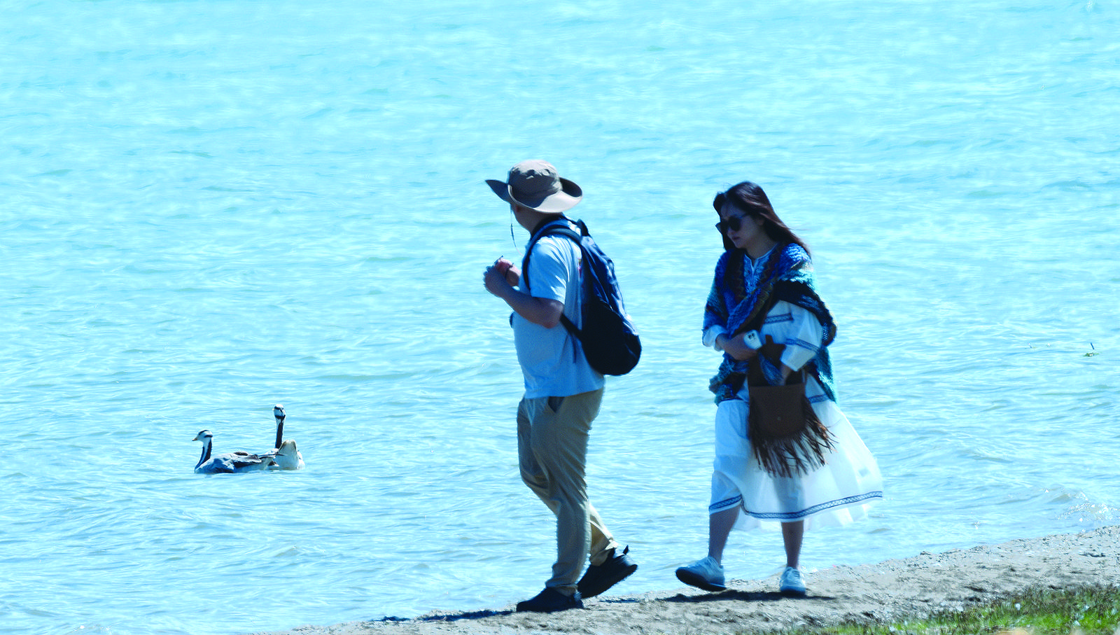 黑馬河敖包觀景點(diǎn)每天的客流量較大,也因此成為了斗格才讓夫妻的重點(diǎn)巡護(hù)區(qū)域。一天,巡護(hù)途中,斗格才讓突然放慢了腳步、壓低了聲音,原來(lái)是發(fā)現(xiàn)了一群斑頭雁在湖邊“散步”,他詳細(xì)地記錄到了巡護(hù)日志里。