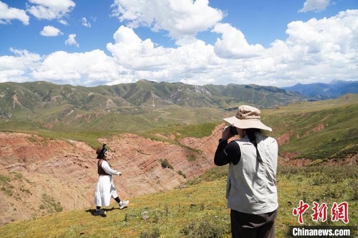 圖為文旅達人在高原河谷之上拍照。馬銘言 攝