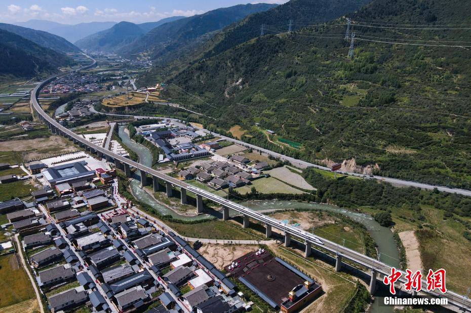 圖為一列動車組運行在川青鐵路黃龍九寨站至松潘站區(qū)間。(無人機照片)中新社記者 劉忠俊 攝