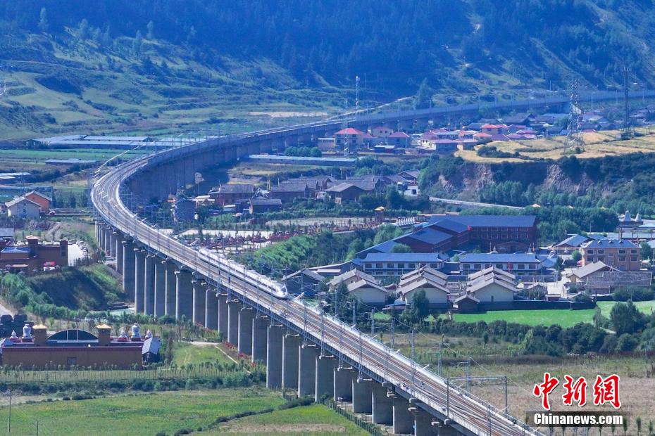 圖為一列CRH2G型高寒動車組運行在川青鐵路黃龍九寨站至松潘站區(qū)間高架橋段。(無人機照片)中新社記者 劉忠俊 攝