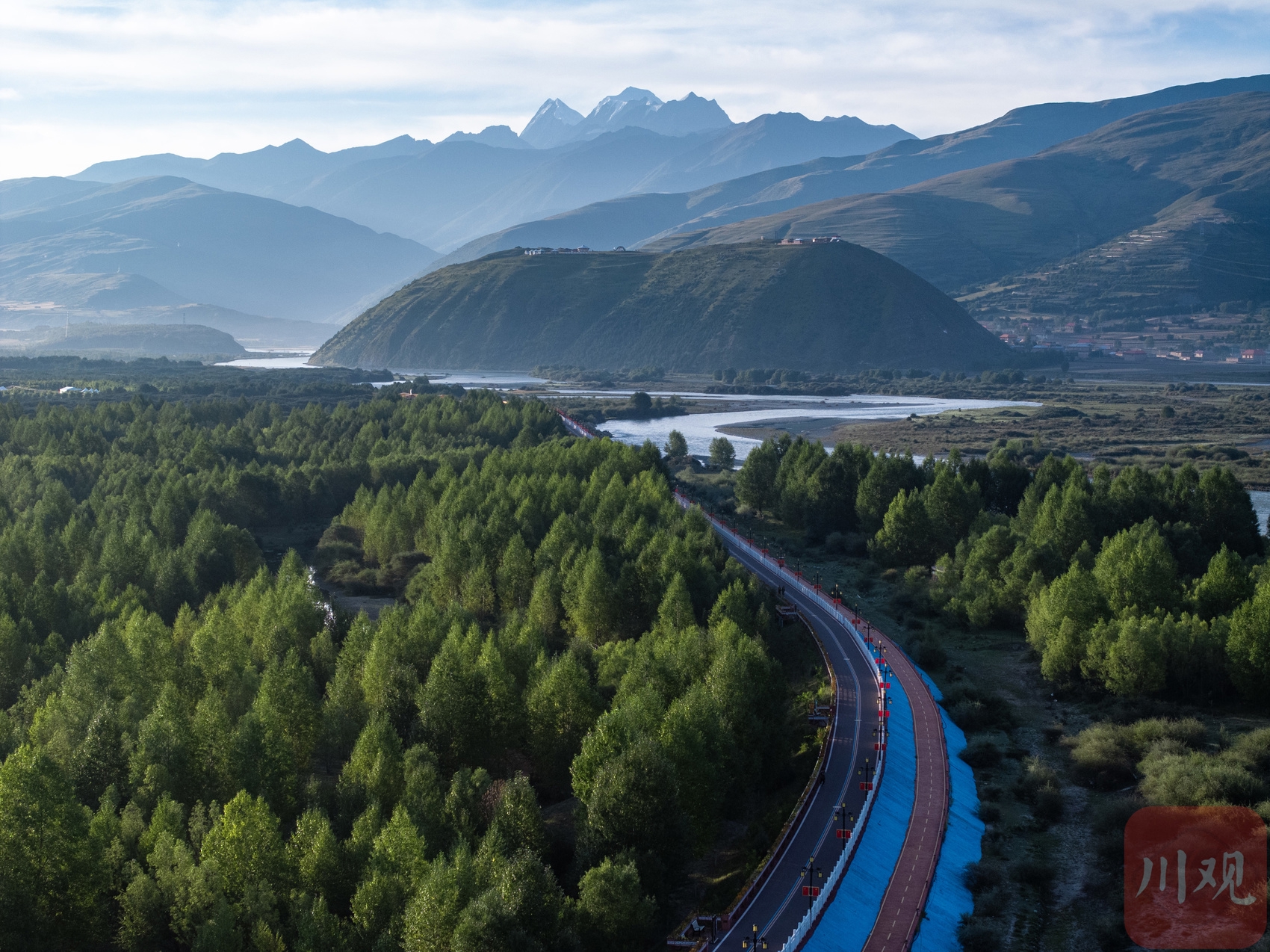 現(xiàn)在的雅礱林卡濕地公園樹木茂盛、水質(zhì)清澈,雅礱江如一條翡翠腰帶貫穿于此,從西北向東南流去,藍(lán)天、白云、雪山掩映下,成為317國道上一道靚麗風(fēng)景。