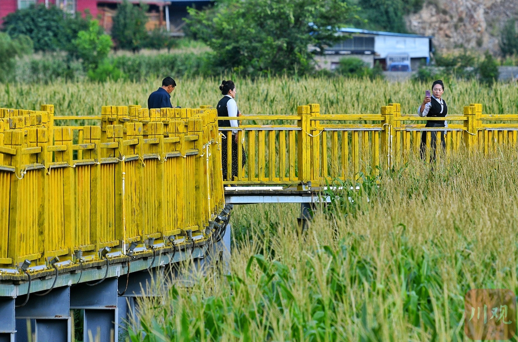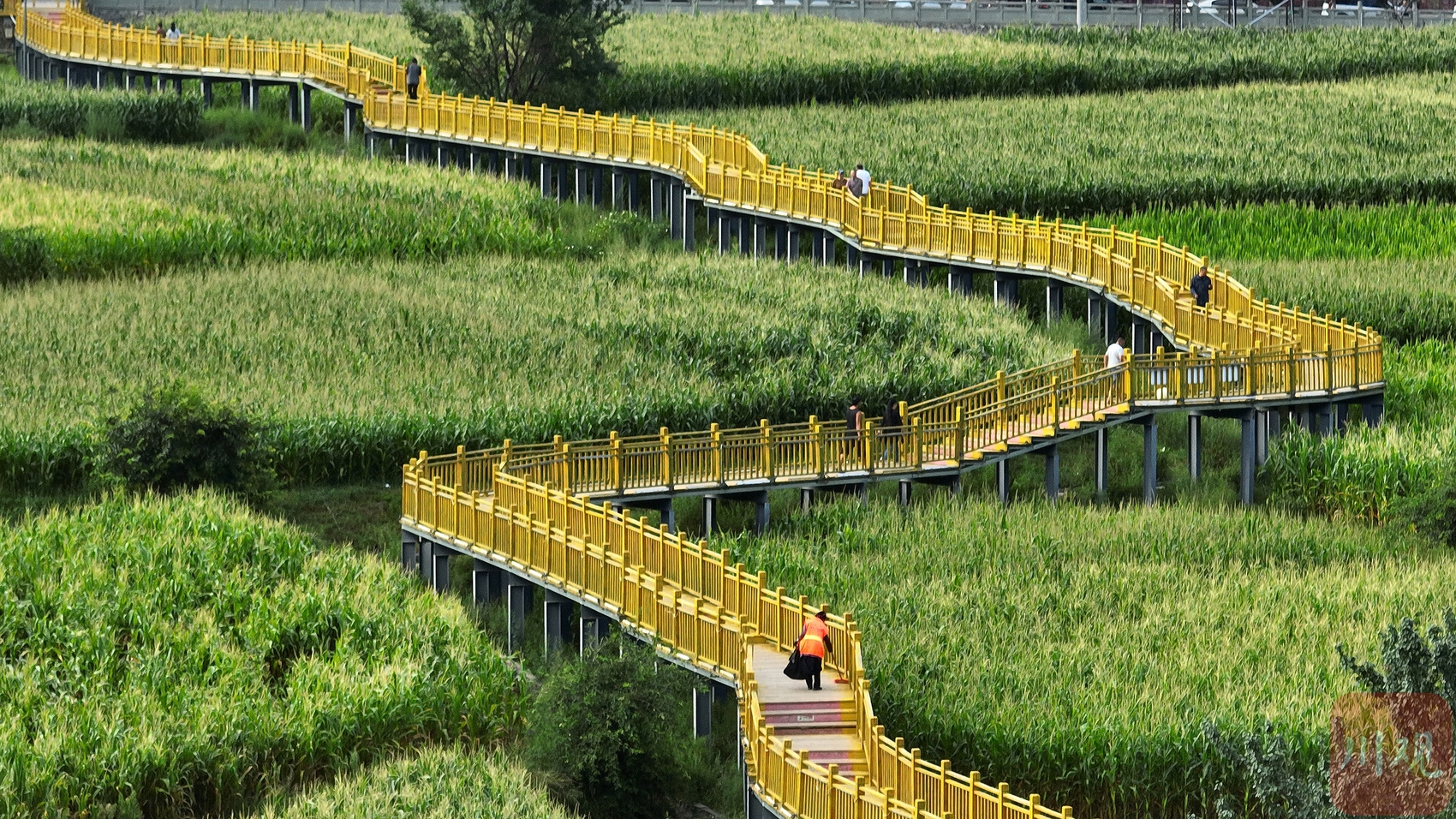 28日晨,記者從住地步行到縣城邊的“田園棧道”,只用了10分鐘。此時晨光中天色已泛藍,田地里懸空架起的棧道,從郁郁蔥蔥的玉米田里一直曲折延伸,從空中俯瞰如同黃色哈達纏繞在翠綠田間,此景讓人眼前一亮。