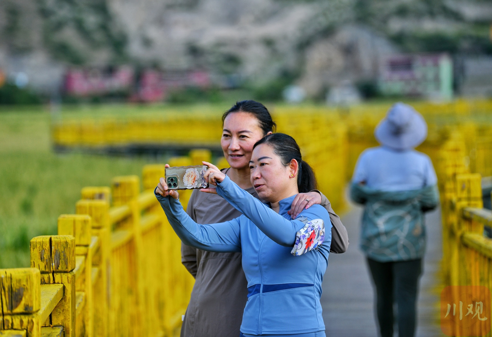 晨練的居民在田園棧道拍照