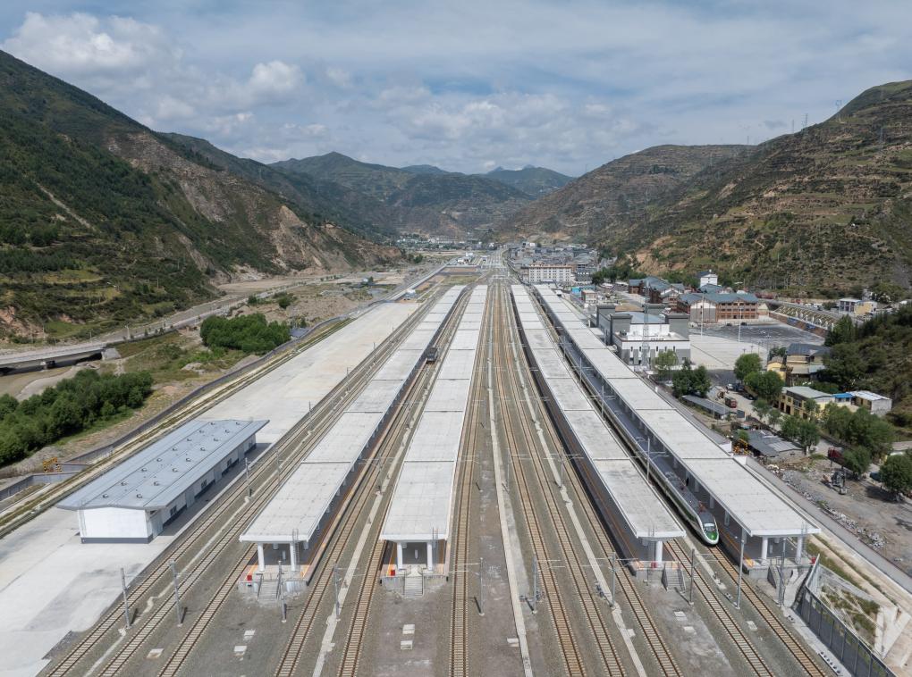 一輛調(diào)試列車停靠在川青鐵路松潘站(8月29日攝)。新華社記者 江宏景 攝