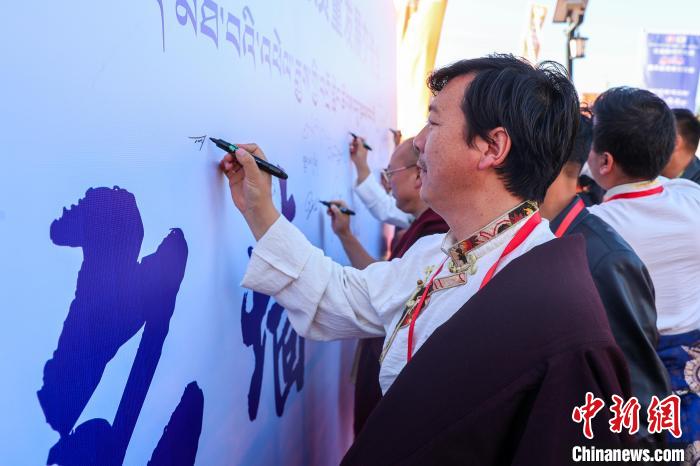 圖為唐卡畫師在簽名墻上簽字。中新社記者 薛蒂 攝