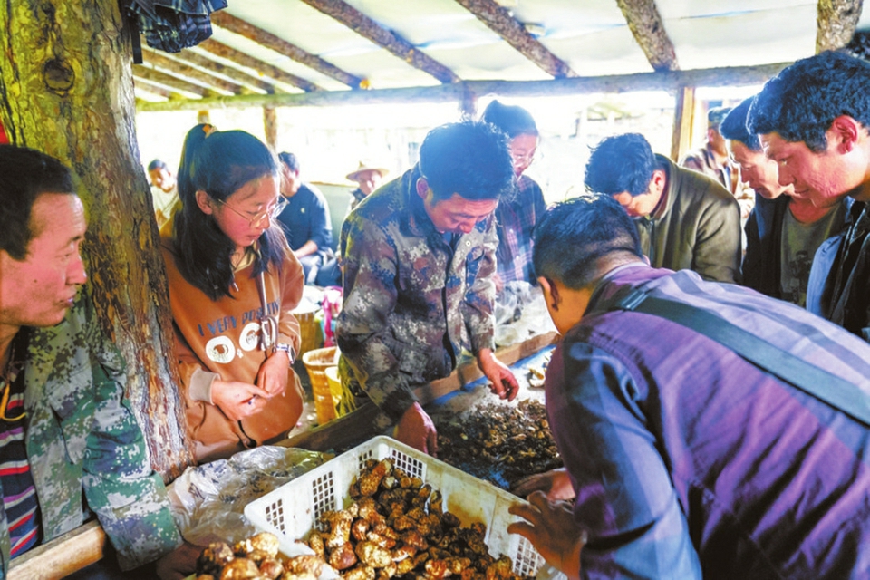 根呷曲比最喜歡喊價(jià)環(huán)節(jié)。價(jià)格是“喊”出來的,卻不是常見的“此起彼伏、扯著嗓門”式地叫價(jià),得益于市場(chǎng)的管理機(jī)制,松茸的收購(gòu)價(jià)格由收貨商和村民代表商量出來。