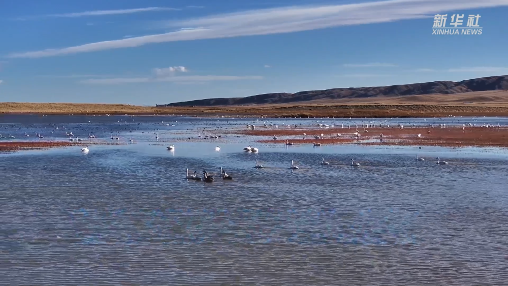 初冬時節(jié),在位于青海省海北藏族自治州剛察縣的青海湖畔,成百上千只大天鵝在此越冬棲息。成群的大天鵝時而振翅飛翔,時而戲水覓食,與碧藍澄澈的青海湖和岸邊的草原相映成景,構成一幅美麗畫卷。