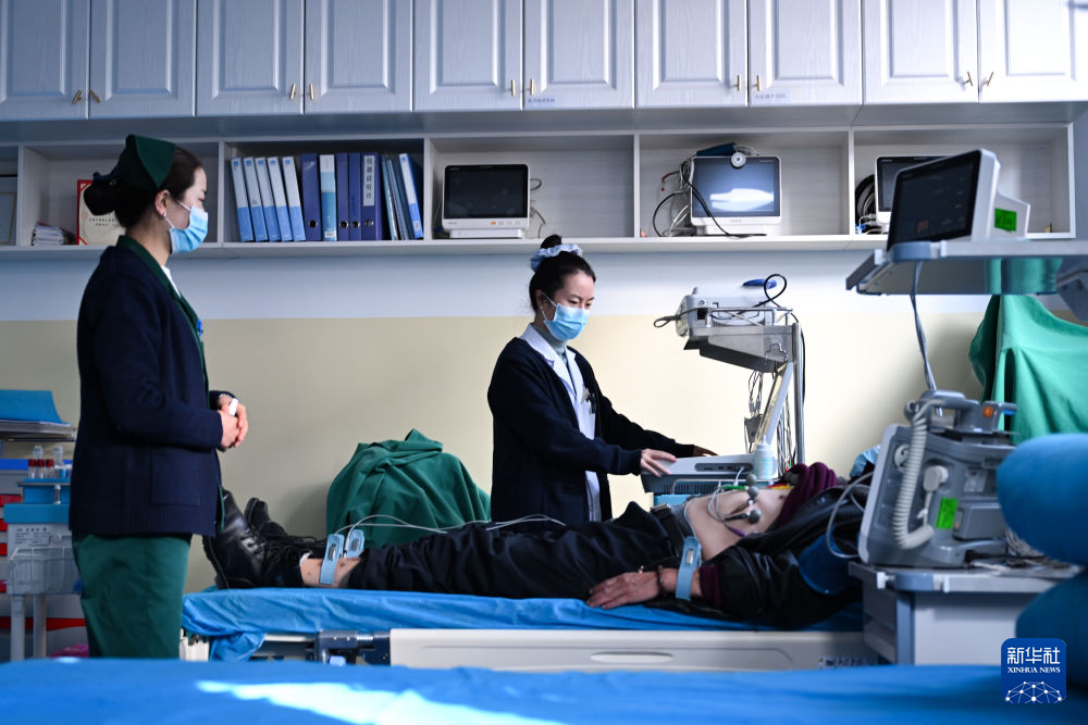 12月17日,在青海省海南藏族自治州共和縣中醫(yī)院,醫(yī)生高俊萍(右)在給患者做心電圖。新華社記者 張龍 攝