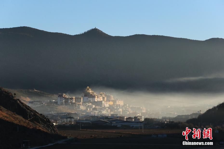 12月24日,晨霧中的松贊林寺景觀。地處云南西北部的迪慶藏族自治州香格里拉市,是云南熱門旅游地,也是世人向往的世外桃源。近年來(lái),該州圍繞“冬看日照金山嬉雪觀鳥”的主題,不斷豐富業(yè)態(tài)服務(wù)好游客,推動(dòng)冰雪世界“冷資源”變?yōu)椤盁峤?jīng)濟(jì)”。中新社記者 黃興鴻 攝