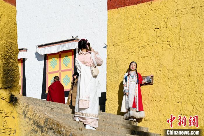 圖為游客在噶丹松贊林寺內(nèi)穿民族服飾拍照。中新社記者 李嘉嫻 攝