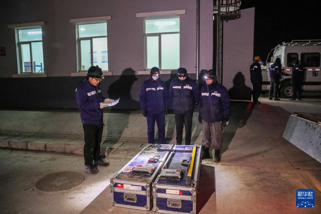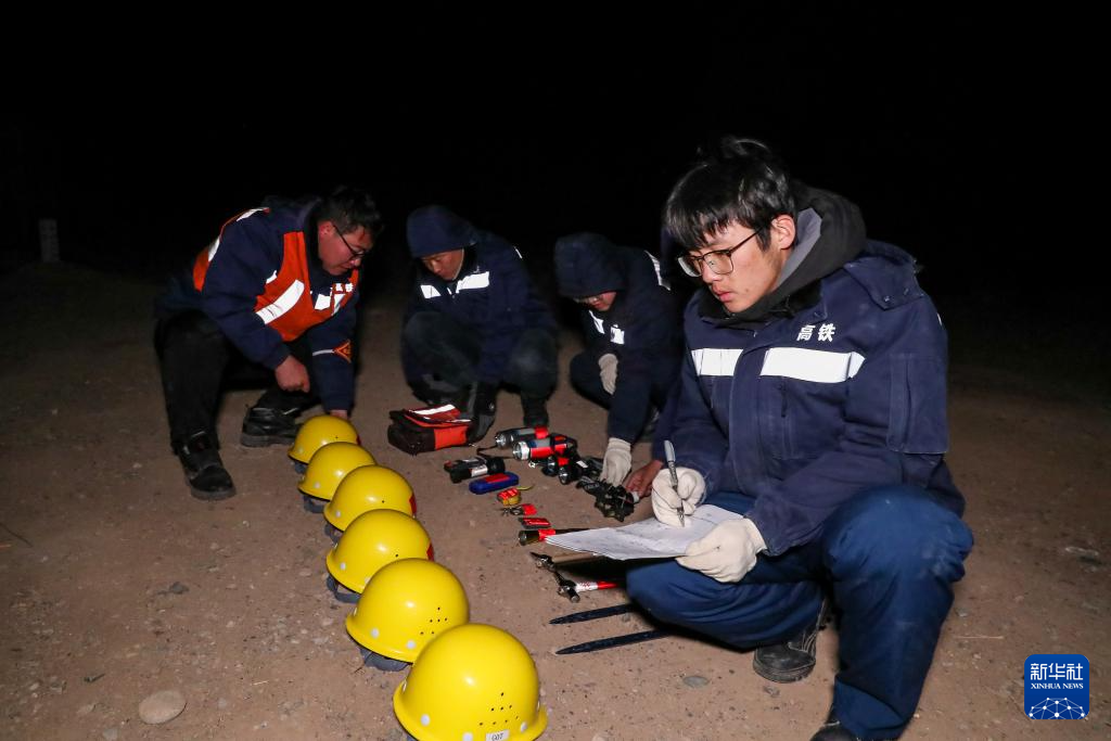 1月13日晚,在天祝西高鐵綜合維修基地,線路工正在清點(diǎn)工具材料。新華社記者 郎兵兵 攝