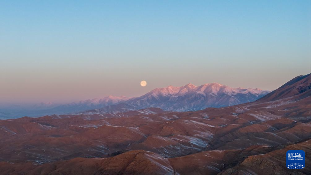 這是1月14日在新烏鞘嶺隧道附近拍攝的山脈與月亮(無人機(jī)照片)。新華社記者 郎兵兵 攝