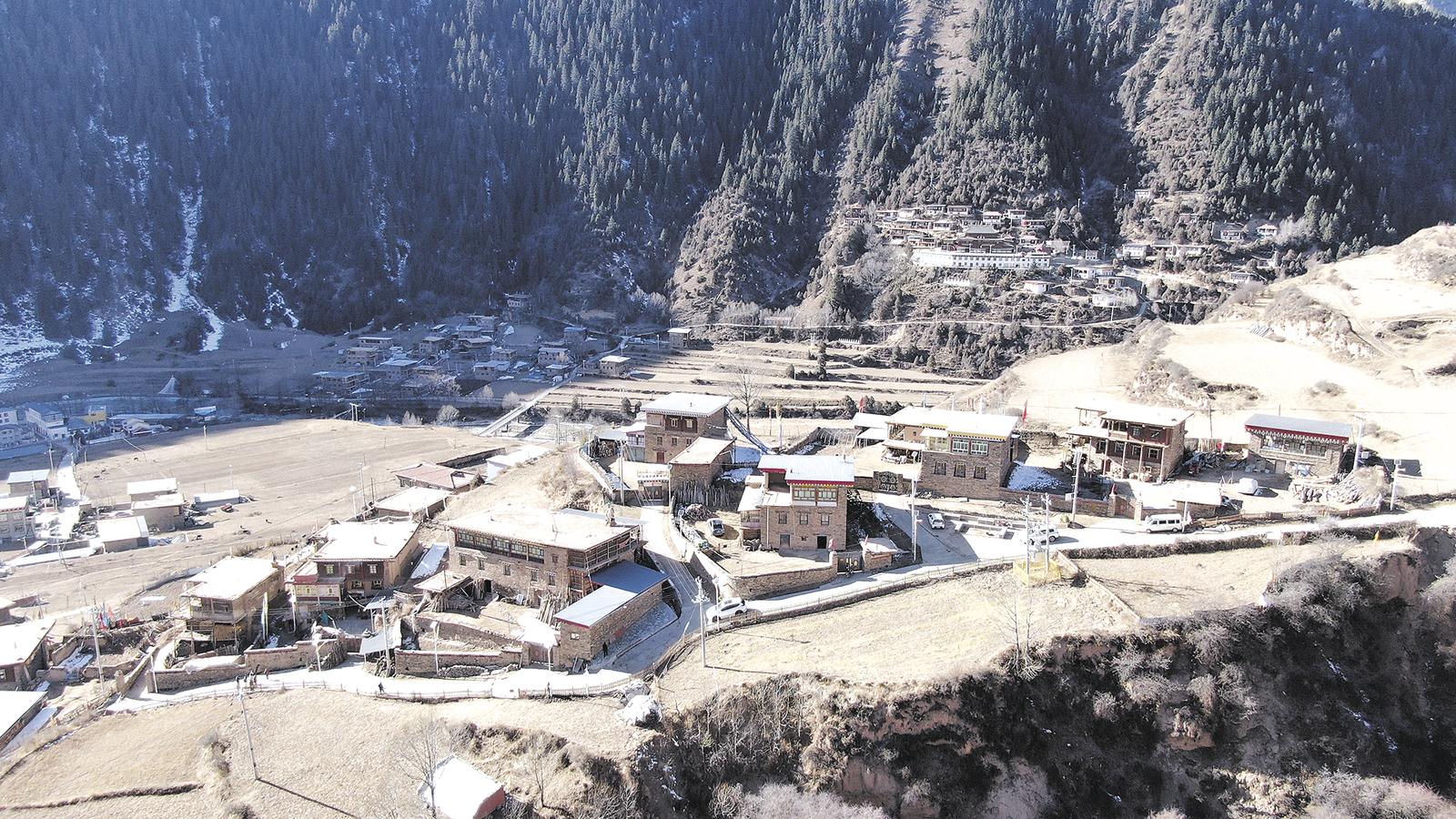 1月13日,記者從班瑪縣出發(fā),沿著蜿蜒的瑪珂河一路南下,來到了“中國保存最完好的藏式碉樓群落之一”的班瑪縣燈塔鄉(xiāng)班前村。走進班前村,只見四面群山環(huán)繞,不遠處,結(jié)著冰的瑪珂河像一條白絲帶,在陽光的照耀下格外耀眼。依山傍水的班前村地勢起伏較大,行走其間多半為上坡路,不一會兒,記者來到一處相對平坦的房屋前,上面掛著的匾額上赫然寫著“中國傳統(tǒng)村落——班前村”。