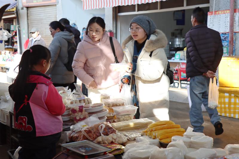 春節(jié)期間,不少來香格里拉市旅游的游客走進城區(qū)農(nóng)貿(mào)市場,選購當?shù)靥厣朗?,感受當?shù)亍吧嗉馍系奈幕薄D為游客在向陽農(nóng)貿(mào)市場購買本地美食。