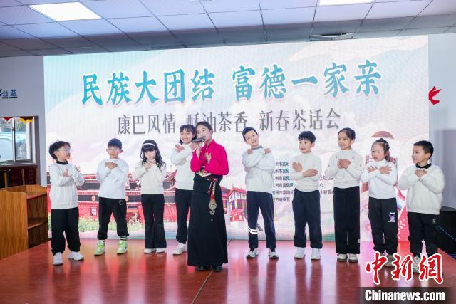 藏族姑娘拉尕(中)在杭州富陽(yáng)和漢族小朋友們一起表演節(jié)目。受訪(fǎng)者 供圖
