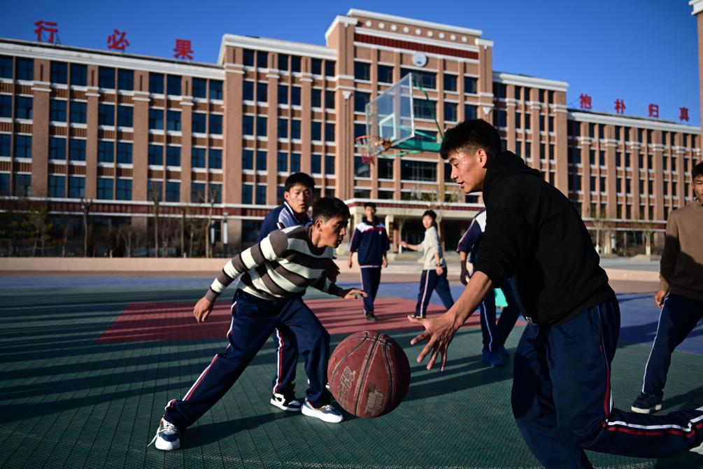2月25日,青海省西寧市果洛西寧民族中學(xué)學(xué)生在課間活動(dòng)時(shí)打籃球。 新華社記者 張龍 攝